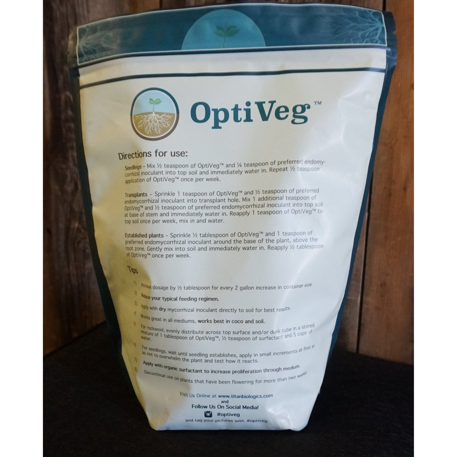 Established plants - Sprinkle ½ tablespoon of OptiVeg™ and 1 teaspoon of preferred endomycorrhizal inoculant around the base of the plant, above the root zone. Gently mix into soil and immediately water in. Reapply ½ tablespoon of OptiVeg™ once per week.