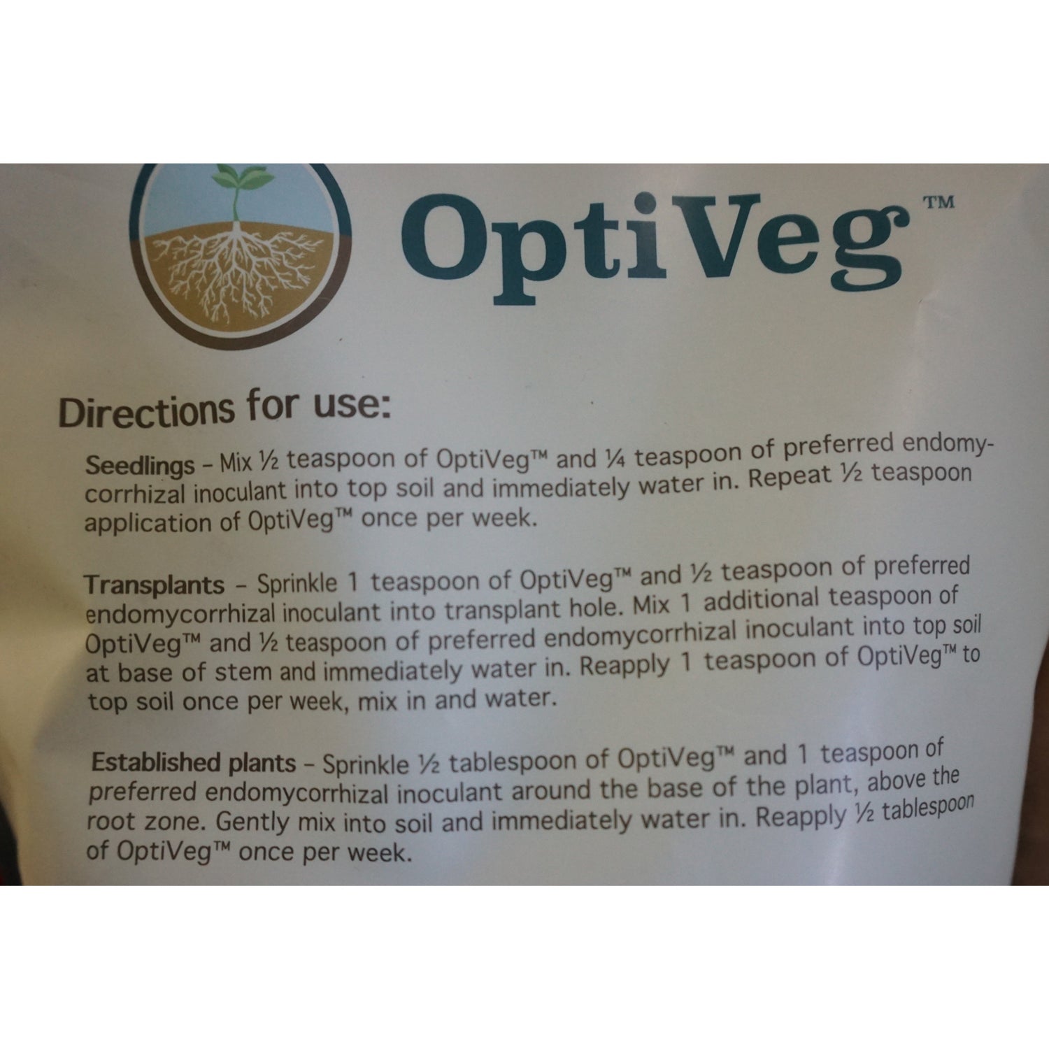 Transplants - Sprinkle 1 teaspoon of OptiVeg™ and ½ teaspoon of preferred endomycorrhizal inoculant into transplant hole. Mix 1 additional teaspoon of OptiVeg™ and ½ teaspoon of preferred endomycorrhizal inoculant into top soil at base of stem and immediately water in. Reapply 1 teaspoon of OptiVeg™ to top soil once per week, mix in and water.