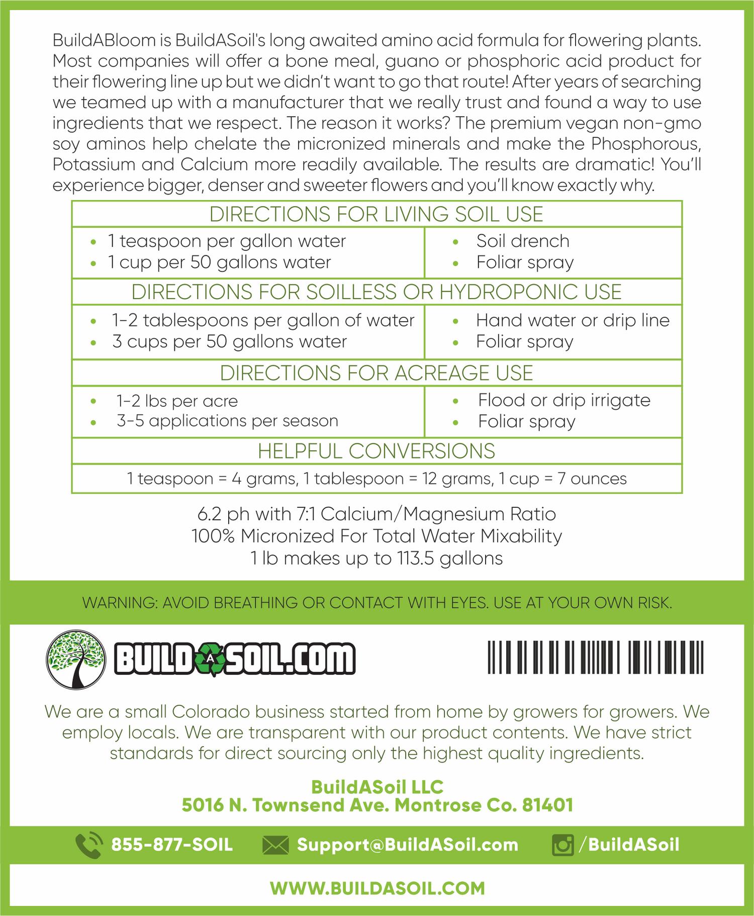 BuildABloom is BuildASoil's famous amino acid chelated mineral formula for flowering plants. Most companies will offer a bone meal, guano or phosphoric acid product for their flowering line up, but we didn't want to go that route! The reason it works? The premium vegan non-gmo soy aminos help chelate the micronized minerals and make the phosphorus, potassium and calcium more readily available. The results are dramatic! You'll experience bigger, denser and sweeter flowers and you'll know exactly why. BuildABloom