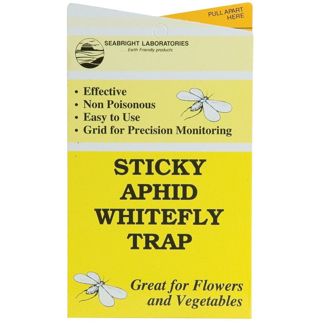 These Sticky Aphid/Whitefly Traps are 4” x 7” Traps that unfold to expose adhesive on both sides to cover approximately 30 sq inches per trap. Yellow coloration of weatherproof cards attracts aphids, whiteflies, leafhoppers, froghoppers, moths and more. Nontoxic traps are simple to hang and mess free. Pack of 5 traps.